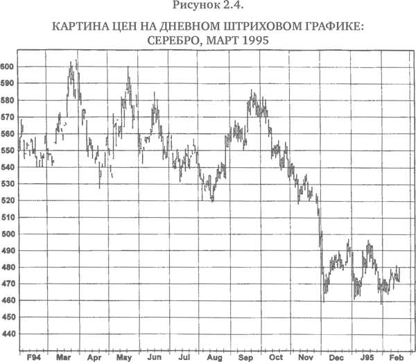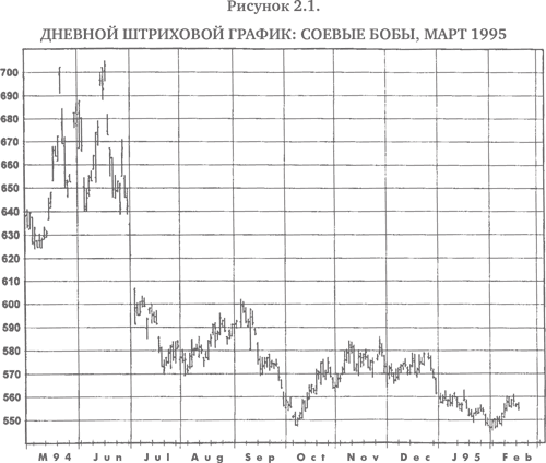 Штриховые графики являются самым распространенным видом графиков цен. В штриховом графике каждый день представлен вертикальным отрезком, проведенным от дневного минимума до дневного максимума. Цена закрытия показана горизонтальным выступом. На рис. 2.1 представлен дневной штриховой график фьючерсных контрактов на сою с поставкой в марте 1995 г.