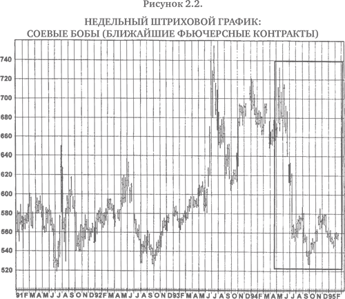 Дневные штриховые графики наиболее подходят для целей биржевой игры, однако графики за более продолжительные периоды времени показывают исключительно важную перспективу. Эти долгосрочные графики (например, недельные, месячные) полностью аналогичны дневным, но здесь вертикальная черта и выступ отражают ценовую амплитуду и конечный уровень цены за соответствующий период. На рис. 2.2 показан недельный штриховой график соевых фьючерсов. Сегмент в прямоугольнике соответствует периоду, изображенному на рис. 2.1. А рис. 2.3 является месячным штриховым графиком соевых фьючерсов. Большой и маленький прямоугольники охватывают периоды, изображенные соответственно на рис. 2.2 и 2.1.