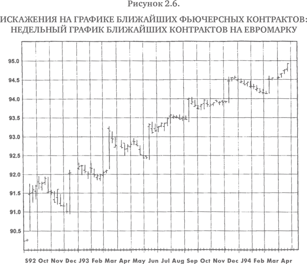 На рис. 2.6 представлен яркий пример искажений такого типа. Обратите внимание на периоды консолидации, перемежающиеся резкими, однонедельными подскоками цен, происходящими каждые три месяца с регулярностью часового механизма. Была ли евромарка в этот период подвержена влиянию некоего события, случавшегося каждые три месяца? В действительности эти всегда значительные однонедельные «взлеты» были отнюдь не реальными подъемами цен, а скорее визуальным отражением перехода от истекающего фьючерса к следующему контракту, который в изображаемые периоды неизменно торговался со значительной премией к предыдущему месяцу.