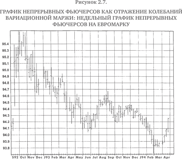 Тот факт, что графики ближайших фьючерсных контрактов подвержены влиянию значительных искажений в том смысле, что движения цен, изображенные на них, могут резко отличаться от результатов, полученных реальным трейдером (как это было в только что представленном случае с евромаркой), делает необходимым альтернативное изображение серии последовательных фьючерсных контрактов, которое не страдало бы указанным недостатком. График непрерывных фьючерсов обеспечивает такую альтернативу.