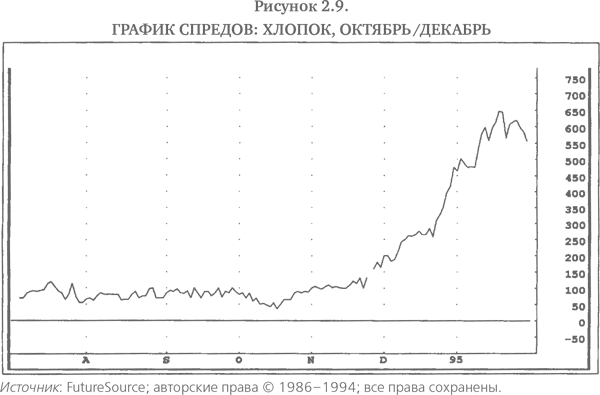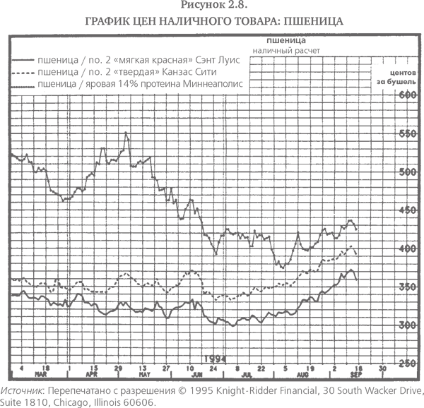 Как следует из названия, графики закрытий строятся на основе цен закрытия и игнорируют информацию о максимумах и минимумах. Некоторые ценовые серии могут быть показаны только в формате закрытий, поскольку не всегда имеются в наличии внутридневные показатели. Двумя примерами являются (1) график цены наличного товара (т. е. спот-рынок, а не фьючерсы, рис. 2.8) и (2) спреды (рис. 2.9). (График спредов изображает разницу цен двух контрактов.)