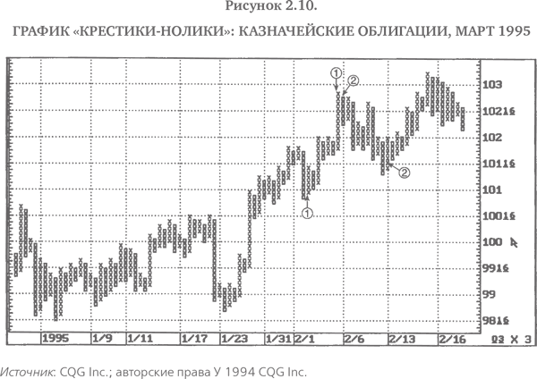На рис. 2.10 показан график «крестиков-ноликов» с масштабом клетки в 3 пункта и порогом разворота в 3 клетки, или 9 пунктов. Иными словами, до тех пор пока не произойдет падение цены на 9 или более пунктов, крестики продолжают добавлять в одну колонку. Когда цена снижается на 9 или более пунктов, начинают новый столбик ноликов, причем первый 0 помещают на одну клетку ниже последнего Х.
