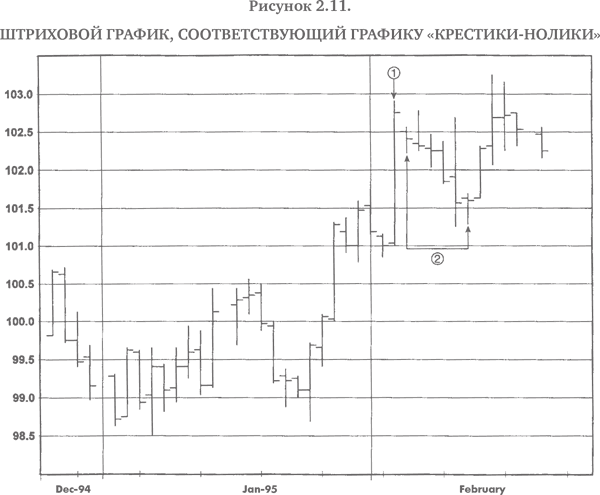 Как было отмечено ранее, график «крестиков-ноликов» не отражает время. Один столбик может представлять и один день, и два месяца. Например, рис. 2.11 показывает штриховой график, соответствующий графику «крестики-нолики» на рис. 2.10. Один день на штриховом графике, обозначенный символом 1, и следующий непосредственно за ним шестидневный период, взятый в скобки под символом 2, соответствуют помеченным теми же цифрами интервалам на графике «крестиков-ноликов». Заметьте, что единственный день занимает на последнем семь колонок, тогда как шестидневный период соответствует 9 столбцам, что лишь немногим больше.