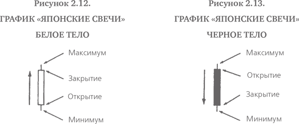«Японские свечи» добавляют новое измерение и цвет в простой штриховой график. Сегмент штриха, который показывает диапазон между ценами открытия и закрытия, представлен двухмерным «телом», а его продолжения к максимуму и минимуму изображены в виде линий или «теней». День, когда цены открытия и закрытия находятся вблизи дневного максимума или минимума, будет иметь протяженное тело, тогда как день с незначительной разницей между ценами открытия и закрытия будет иметь короткое тело. Цвет тела указывает, была цена закрытия выше цены открытия (белый – рис. 2.12) или ниже ее (черный – рис. 2.13). Графики-«свечи» подробно рассматриваются в гл. 13.