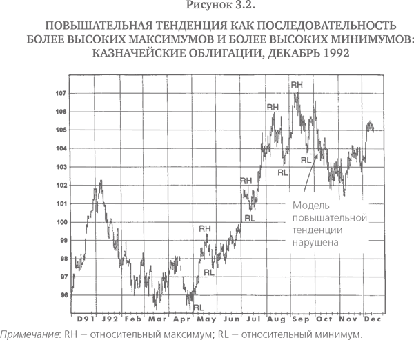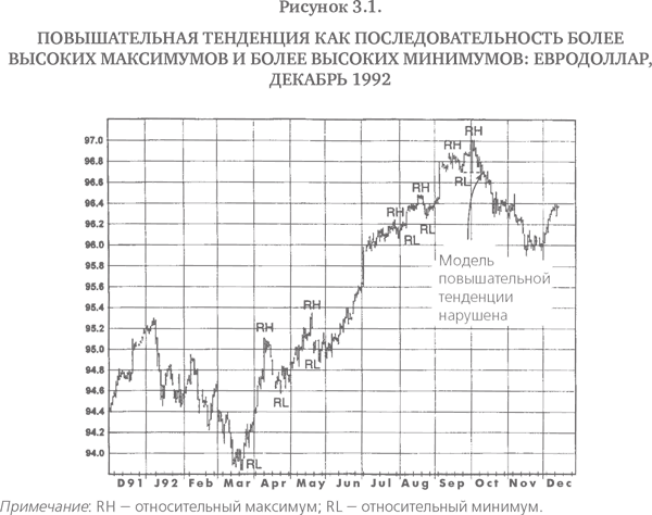 Одним из стандартных определений повышательной тенденции является следующее: последовательность более высоких максимумов и более высоких минимумов. Например, на рис. 3.1 в период с марта по сентябрь каждый относительный максимум (relative high – RH) выше предыдущего максимума и каждый относительный минимум (relative low – RL) выше предыдущего минимума. По существу, повышательная тенденция может рассматриваться как ненарушенная до тех пор, пока не пробит предыдущий относительный минимум. Нарушение этого условия служит предупреждением о том, что тенденция, возможно, закончилась. Например, на рис. 3.1 октябрьский пробой сентябрьского относительного минимума оказывается предвестником последующего падения цен. Следует, однако, подчеркнуть, что прерывание череды более высоких максимумов и более высоких минимумов (или более низких максимумов и более низких минимумов) нужно рассматривать всего лишь как один из возможных признаков, а не бесспорный индикатор разворота долговременной тенденции. На рис. 3.2 представлен еще один пример повышательной тенденции, определяемой как последовательно возрастающие максимумы и минимумы.