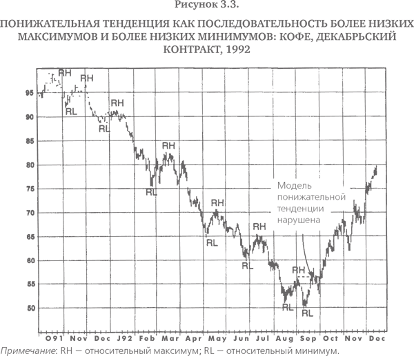 Аналогичным образом, понижательная тенденция может быть определена как последовательность более низких минимумов и более низких максимумов (рис. 3.3). Понижательная тенденция может рассматриваться как ненарушенная до тех пор, пока не пробит предыдущий относительный максимум.