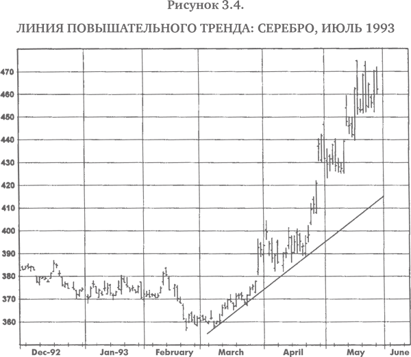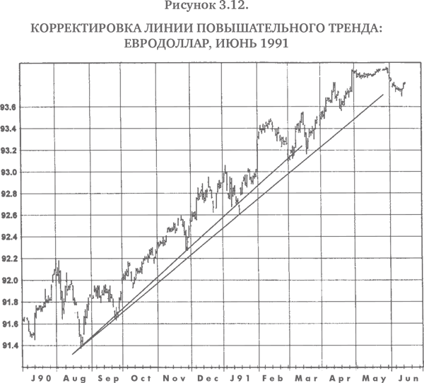 Аналогичным образом, рис. 3.12 идентичен рис. 3.5 с той лишь разницей, что изображаемый период продолжен на пять месяцев. Нижняя линия на рис. 3.12 представляет линию повышательного тренда, которую можно было бы нанести, опираясь на новые данные. Верхняя линия воспроизводит трендовую линию рис. 3.5, построенную на информации, имевшейся до января. Январский пробой этой линии не привел к развороту тенденции, а просто сделал необходимой корректировку трендовой линии.