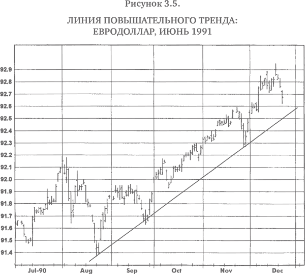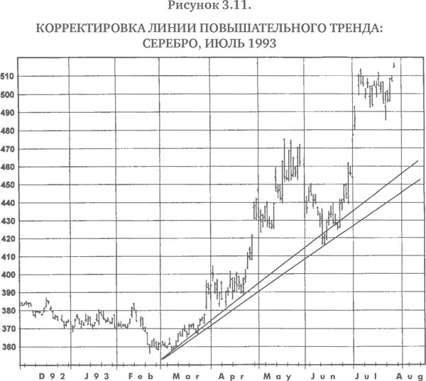 Линии тренда и коридоры являются полезными, однако их значение часто преувеличивают. Легко переоценить надежность трендовых линий, когда они наносятся на графики задним числом. При этом нередко упускают из виду, что по мере развития «бычьего» или «медвежьего» рынка линии тренда зачастую нуждаются в корректировке. Таким образом, хотя пробой линии тренда будет иногда служить сигналом раннего предупреждения о развороте тенденции, однако с равным успехом подобное развитие событий может привести всего лишь к простой коррекции линии тренда. Например, рис. 3.11 содержит продолжение графика на рис. 3.4 еще на два месяца. Нижняя линия на рис. 3.11 представляет линию тренда, которую можно было бы провести, опираясь на все имеющиеся данные. Верхняя линия является продолжением трендовой линии на рис. 3.4, построенной по ценовым данным, имевшемся до июня. Июньский пробой этой линии не привел к развороту тенденции, а просто сделал необходимой корректировку трендовой линии. Стоит заметить, что модель более высоких минимумов и более высоких максимумов осталась ненарушенной даже после июньского пробоя линии тренда.