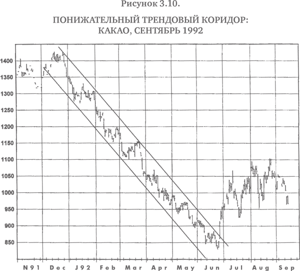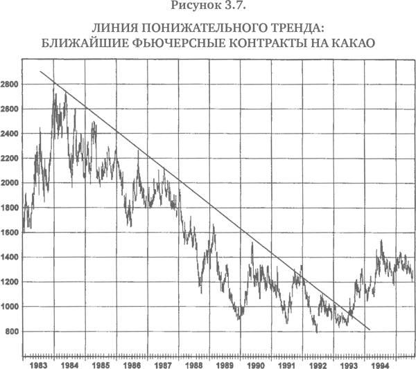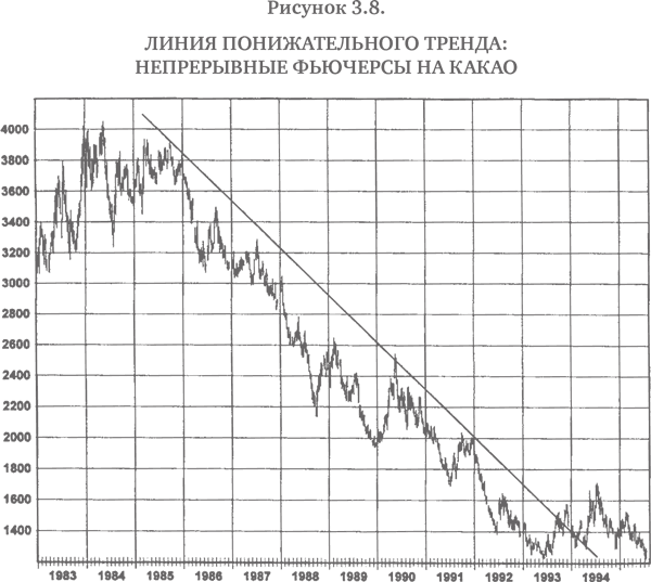 Повышательные и понижательные тенденции (или тренды, что то же самое) часто на графиках выделяют прямыми линиями (линиями тренда). Линия повышательного тренда соединяет последовательность минимумов (рис. 3.4 и 3.5); линия понижательного тренда соединяет последовательность максимумов (рис. 3.6). Линии тренда могут иногда продолжаться многие годы. Например, на рис. 3.7 (график ближайшего контракта) и 3.8 (непрерывные фьючерсы) показаны длившиеся почти десятилетие понижательные тренды цен на какао. Нередко реакция против ценовой тенденции начинается вблизи линии, параллельной линии тренда. Параллельные линии, ограничивающие ценовой тренд, называются трендовыми коридорами (trend channels). На рис. 3.9 и 3.10 показаны долговременные повышательные и понижательные трендовые коридоры.