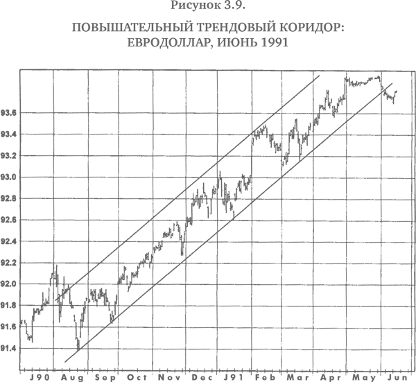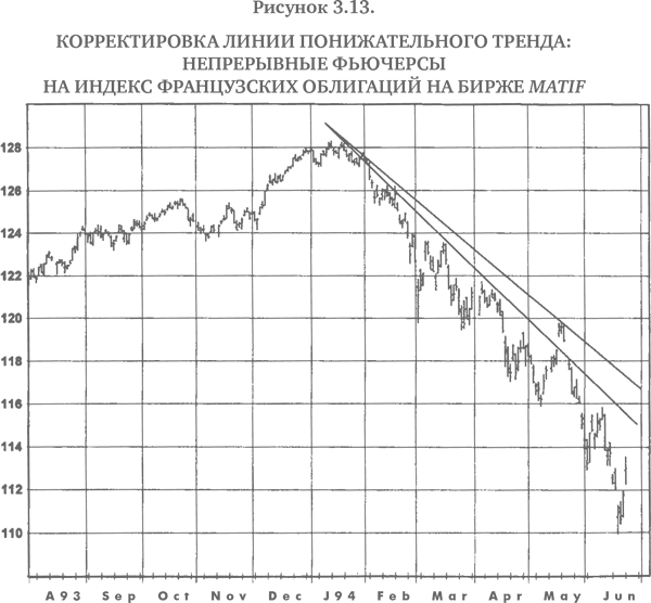 Приведенные примеры свидетельствуют о том, что пробой трендовой линии является скорее правилом, чем исключением. Неоспоримым фактом является то обстоятельство, что линии тренда должны быть пробиты, иногда неоднократно, в ходе их эволюции, что равнозначно словам о том, что линии тренда часто корректируются по мере их продления. Важные выводы из этого наблюдения заключаются в следующем: линии тренда намного лучше работают задним числом, чем в режиме реального времени, и пробои трендовых линий нередко оказываются ложными сигналами. К последнему соображению мы еще вернемся в гл. 11.