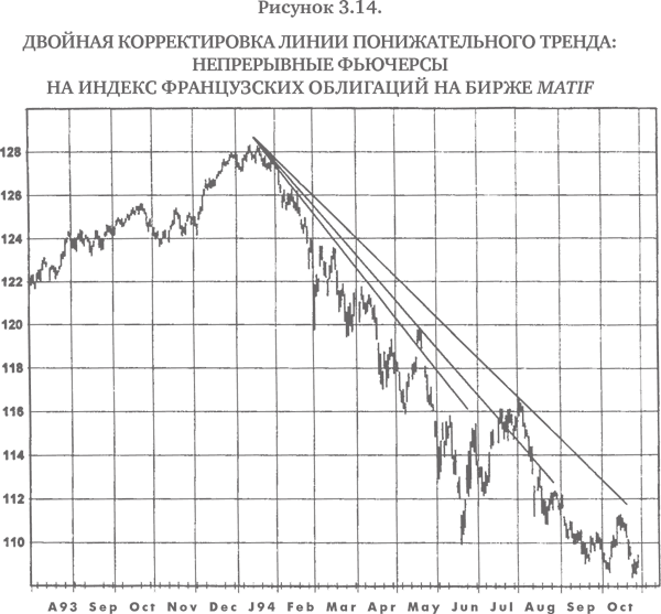 На рис. 3.13 представлен аналогичный пример для понижательной линии тренда. Этот рисунок идентичен рис. 3.6 за исключением того, что изображаемый период продолжен на два месяца. Верхняя линия на рис. 3.13 представляет понижательную линию тренда, которую можно было бы нанести, опираясь на новые данные. Нижняя линия воспроизводит трендовую линию рис. 3.6, построенную на информации, имевшейся до мая. Майский пробой этой линии не привел к развороту тенденции, а просто сделал необходимой корректировку трендовой линии. Аналогичным образом, рис. 3.14 идентичен рис. 3.6 и 3.13 с той лишь разницей, что изображаемый период продолжен еще на четыре месяца (относительно рис. 3.13). Нижние линии перенесены с рис. 3.6 и 3.13 и представляют собой линии тренда по состоянию до мая и июля соответственно. Пробой этих линий не привел к развороту тенденции, а просто сделал необходимой корректировку трендовой линии. Этот пример показывает, что линию тренда иногда приходится корректировать несколько раз.