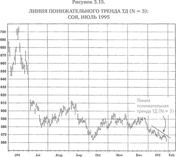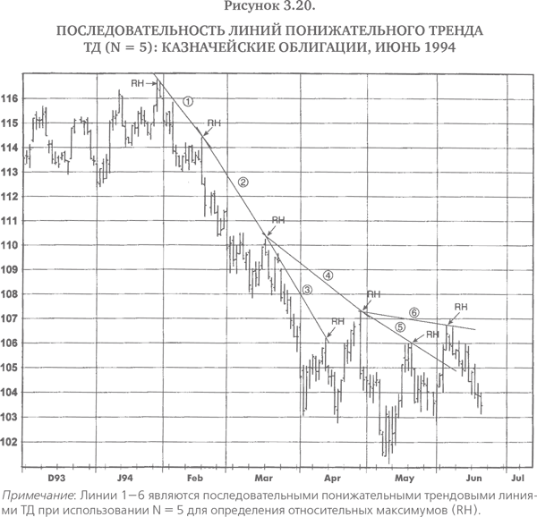 Линия понижательного тренда ТД. Текущая линия понижательного тренда определяется как линия, связывающая самый последний относительный максимум и предыдущий относительный максимум, который должен быть выше самого последнего относительного максимума. Последнее условие является важным, поскольку обеспечивает то, что линия тренда, связывающая два относительных максимума, действительно направлена вниз. На рис. 3.15 показана понижательная линия тренда ТД, где для определения относительных максимумов использовалось значение параметра N = 3.
