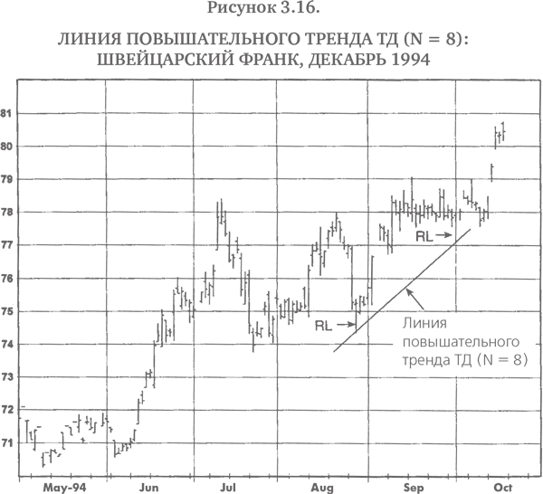 Повышательная линия тренда ТД. Текущая повышательная линия тренда определяется как линия, связывающая самый последний относительный минимум и предыдущий относительный минимум, который должен быть ниже самого последнего относительного минимума. На рис. 3.16 показана повышательная линия тренда ТД, где для определения относительных минимумов использовалось значение параметра N = 8.