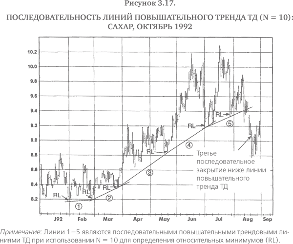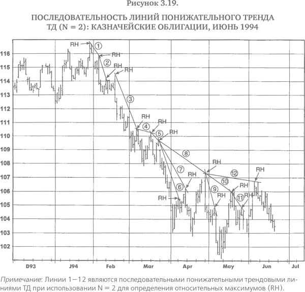 Определение трендовых линий исходя из самых последних относительных максимумов и минимумов позволяет постоянно корректировать линии тренда по мере появления новых относительных максимумов и относительных минимумов. Например, рис. 3.17 демонстрирует последовательность повышательных трендовых линий ТД, которые были построены вслед за появлением новых относительных минимумов (при N = 10) вплоть до получения сигнала о развороте тренда. На этом графике сигнал разворота тренда определяется как три последовательных закрытия ниже действующей повышательной трендовой линии. Аналогичным образом рис. 3.18 иллюстрирует последовательность понижательных трендовых линий ТД, построенных по относительным максимумам (при N = 8) вплоть до получения сигнала о развороте тенденции (также определяемого как три последовательных закрытия за пределами линии тренда).