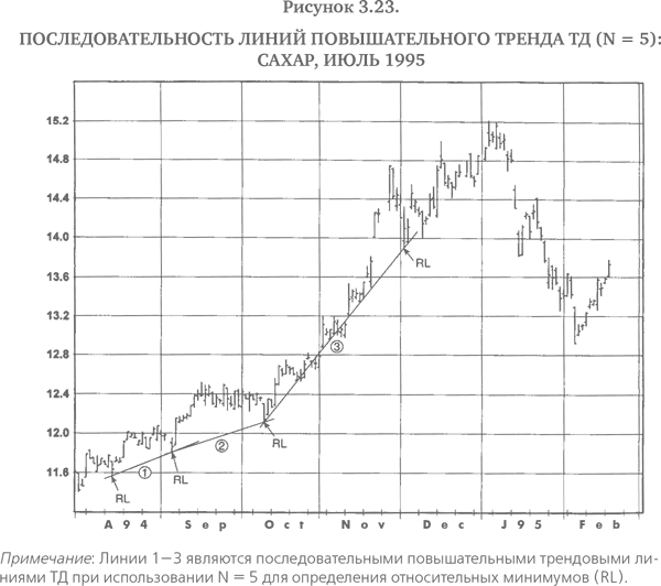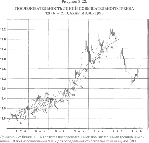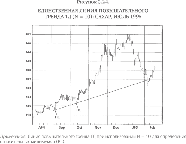 Аналогичным образом, на рис. 3.22–3.24 сопоставлены повышательные линии тренда ТД, полученные на одном и том же графике при использовании трех разных значений N. Как можно видеть на рис. 3.22, когда значение N является низким (например, N = 2), линия тренда чувствительна к быстрым изменениям цены и корректируется очень часто. Действительно, за период роста цен (август – декабрь) проведено 16 различных трендовых линий. При N = 5 число повышательных трендовых линий сокращается за тот же период до трех, а при N = 10 имеется лишь одна линия тренда. Как показывают эти примеры, выбор значения N оказывает огромное значение на построение линий тренда и принимаемые на их основе торговые решения.