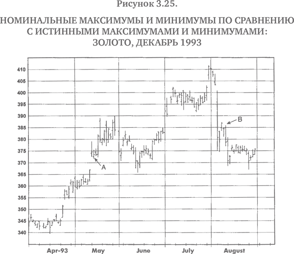 Например, на рис. 3.25, где использовано значение N = 1, точку А можно было бы определить как относительный минимум, основанный на номинальном дневном минимуме. Однако эта точка характеризуется как относительный минимум только потому, что в предыдущий день был резкий верхний разрыв, и она вряд ли отвечает нашему интуитивному представлению об относительном минимуме. Аналогичным образом, точку В можно было бы определить как относительный максимум, основанный на номинальном, а не истинном максимуме (поскольку в предыдущий день, когда случился нижний разрыв, был отмечен более высокий истинный максимум). В обоих случаях использование истинных максимумов и минимумов вместо номинальных дневных максимумов и минимумов позволяет получить интуитивно более правильные координаты относительных максимумов и минимумов.