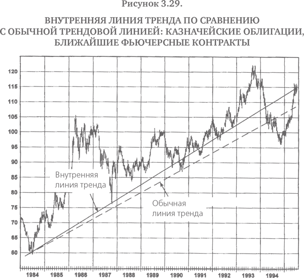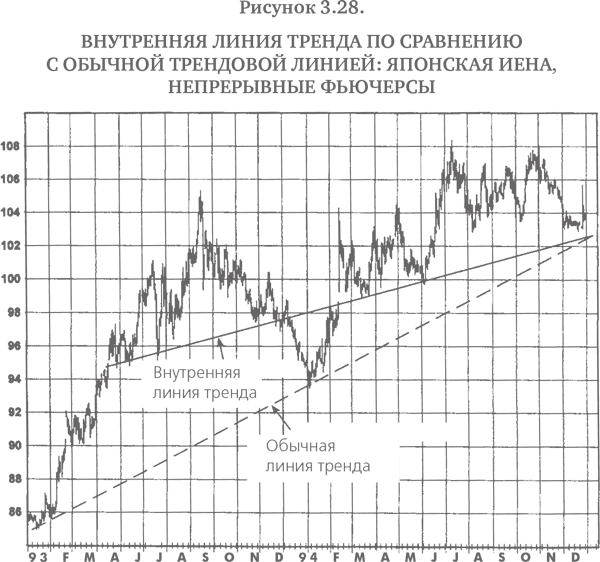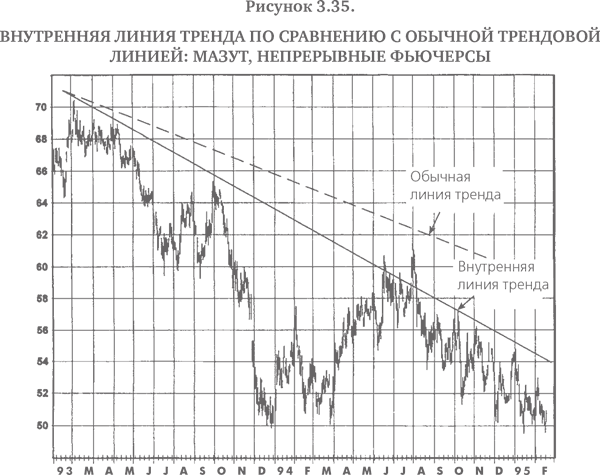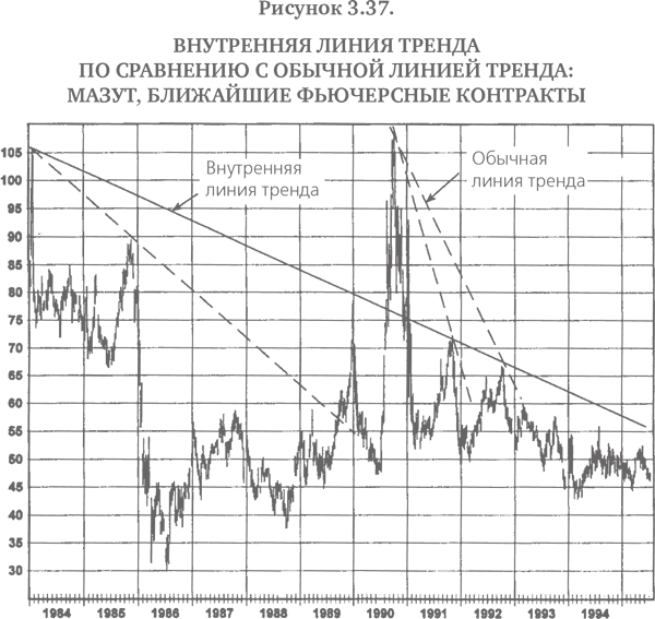 Тот факт, что лично я считаю внутренние линии тренда намного более полезными, чем обычные линии тренда, ничего не доказывает – любопытные наблюдения отдельного индивидуума вряд ли могут служить научным доказательством. На самом деле, принимая во внимание субъективный характер внутренних трендовых линий, было бы очень трудно провести научное тестирование их надежности. Тем не менее моя точка зрения состоит в том, что внутренние линии тренда – это то, что серьезному графическому аналитику, безусловно, следовало бы использовать в работе. Я уверен, что, занимаясь этим, многие читатели также придут к выводу, что внутренние линии тренда намного эффективнее обычных трендовых линий или по крайней мере служат полезным дополнением к инструментарию графического аналитика.