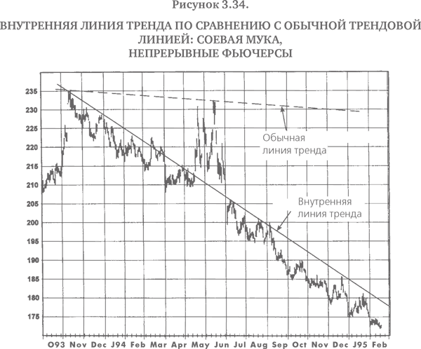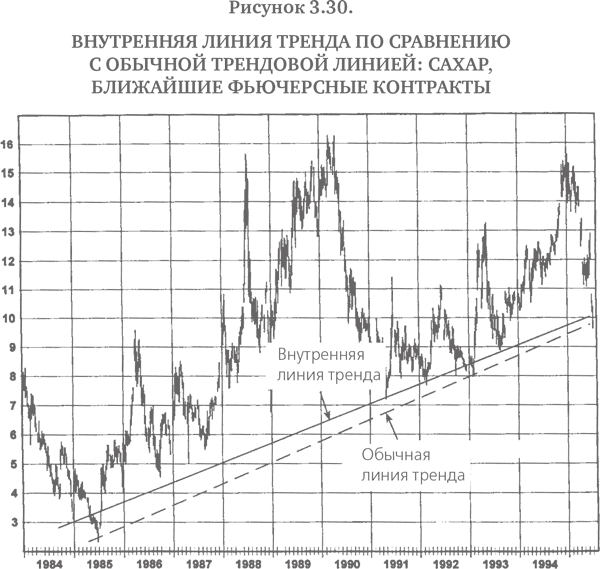 Стандартные линии тренда обычно проводятся через ценовые экстремумы (т. е. максимумы или минимумы). Однако существует мнение, что экстремальные цены соответствуют кратковременным движениям рынка, связанным с избытком эмоций у участников торгов, и что поэтому данные точки могут не соответствовать реальной тенденции рынка. Внутренние линии тренда позволяют обойти молчаливо подразумеваемое требование о проведении трендовых линий через экстремальные точки графика. Внутренняя линия тренда проводится максимально близко к большинству относительных максимумов или относительных минимумов и при этом игнорирует экстремальные точки. Иначе говоря, внутреннюю линию тренда можно представить как линейную аппроксимацию точек относительных максимумов или относительных минимумов. На рис. 3.26–3.37 представлен широкий спектр примеров внутренних повышательных и понижательных трендовых линий, охватывающих графики отдельных контрактов, дневные графики непрерывных фьючерсов и недельные графики ближайших фьючерсных контрактов. Для сравнения на этих графиках показаны также обычные линии тренда[4], изображенные в виде пунктирных линий.