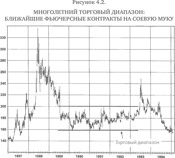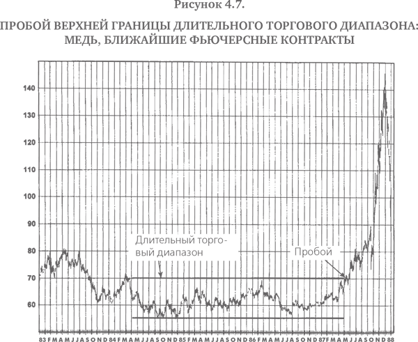 В установившемся торговом диапазоне (т. е. существующем один-два месяца), рынок будет встречать сопротивление на верхней границе диапазона и поддержку на его нижней границе. Хотя графический анализ лучше всего использовать в условиях сильного тренда, некоторые проворные трейдеры умудряются зарабатывать в торговых диапазонах, продавая при подъемах цен и покупая при их снижении. В целом, подобную торговую тактику трудно реализовать с успехом. Более того, следует подчеркнуть, что мелкие второстепенные тенденции внутри торгового диапазона могут обернуться катастрофой, если не лимитировать убытки (например, ликвидировать позицию, когда цены выходят из диапазона на заданное минимальное значение, или рынок торгует за пределами диапазона в течение определенного количества дней, либо то и другое вместе).