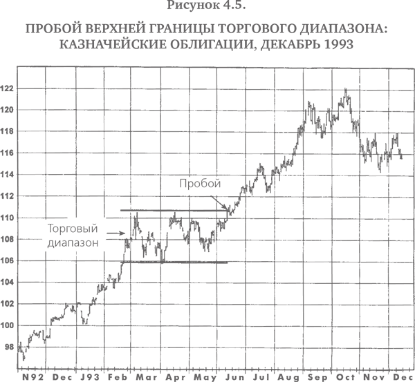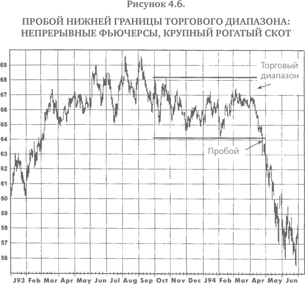 Пробой за пределы торгового диапазона (рис. 4.5 и 4.6) предполагает грядущее движение цен в направлении пробоя. Значимость и надежность пробоя часто повышают следующие факторы: