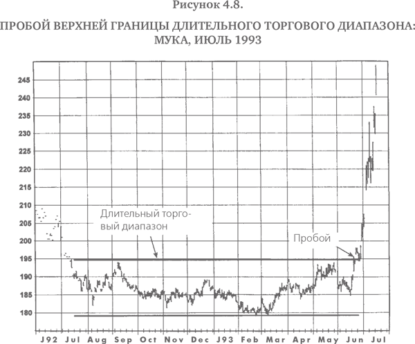 2. Узость диапазона. Пробои из узких диапазонов дают, как правило, особенно надежные сигналы к торговле (рис. 4.9 и 4.10). Более того, такая торговля может быть исключительно привлекательной, поскольку обоснованные защитные остановки предполагают сравнительно низкий денежный риск.