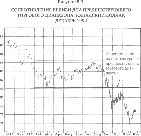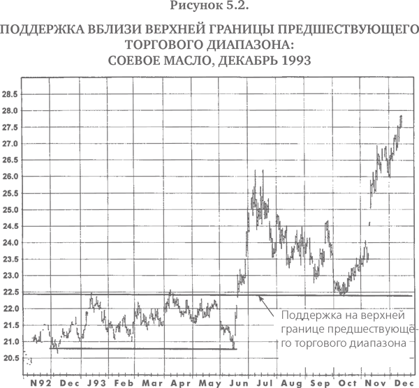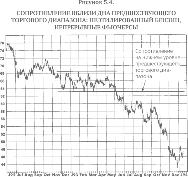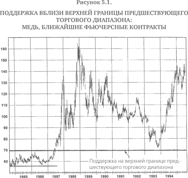 После того как цены вырываются из торгового диапазона, уровень, служивший ранее сопротивлением, становится поддержкой, и наоборот. В частности, когда цены демонстрируют выход вверх из торгового диапазона, верхняя граница этого диапазона становится зоной ценовой поддержки. Линии на рис. 5.1 и 5.2 являются уровнями поддержки, которые ранее были верхними границами предшествующих торговых диапазонов. В случае выхода цен вниз из торгового диапазона нижняя граница этого диапазона становится зоной ценового сопротивления. Продолженные линии на рис. 5.3 и 5.4 указывают на уровни сопротивления, служившие нижними границами предыдущих торговых диапазонов.