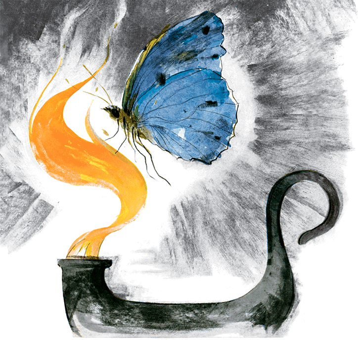 Налюбовавшись вдоволь, мотылек решил поближе познакомиться с ярким огоньком и поиграть с ним, как обычно забавлялся в саду с цветами, раскачиваясь на их венчиках, словно на качелях. Отлетев немного в сторону, он сделал крутой поворот и пролетел, почти касаясь желтого язычка пламени и как бы приглашая его к игре.