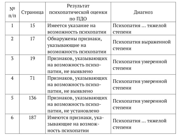 Хотя нам понятно, что экспертный и феноменологический подходы к диагностированию психопатий и доклинических психопатических состояний мало совместимы между собой, все-таки сделана попытка провести некоторые аналогии в оценке тяжести психопатического состояния между этими подходами.