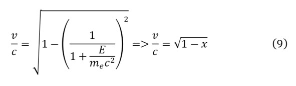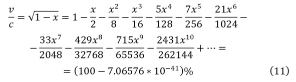 Где, из имеющейся величины энергии можно вычислить скорость (8), но для достаточного решения, стоит изначально разложить полученный корень с преобразованием (9—10) в ряд Тейлора (11), откуда можно будет получить значение в процентном соотношении.