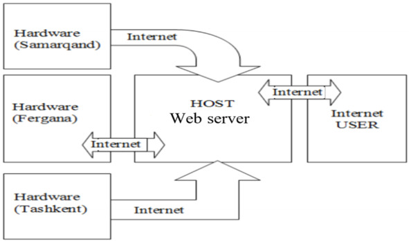 В целях реализации предложенной информационно-измерительной системы в городах Фергана, Ташкент и Самарканд установлены три «Програмно – аппаратный измерительный комплекс». Результаты измерений, полученные с этих комплексов, вносятся в информационную базу через приложения веб-сервера на сайте pribori.uz. На рисунке 3 показана структурная схема системы.