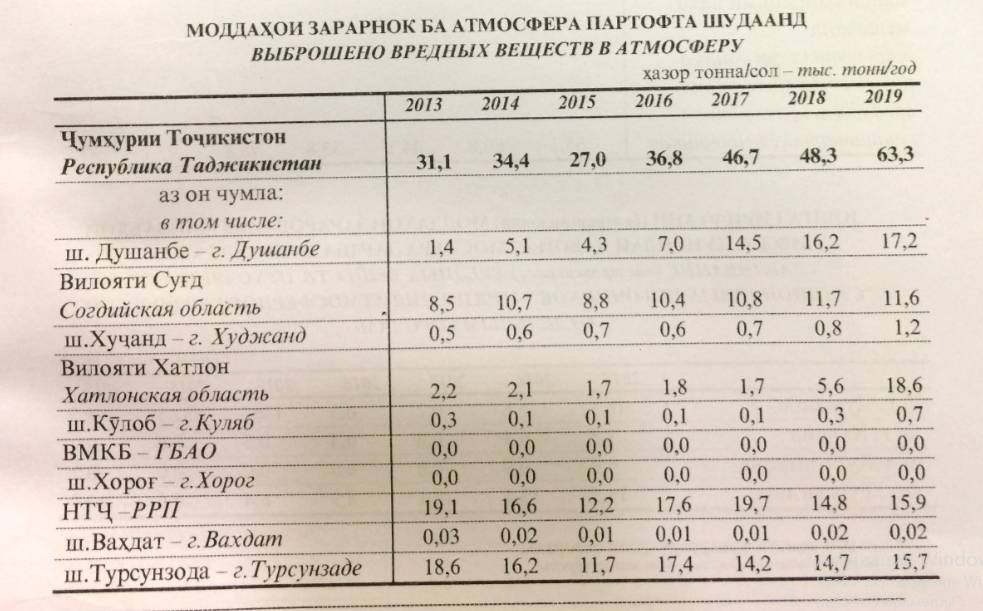 Манбаи маълумотдиҳӣ дар бораи партовҳои моддаҳои зарарнок ба ҳавои атмосфера дар Тоҷикистон Агентии омор мебошад, ки он маълумоти расмӣ пешниҳод менамояд (www.stat.tj). Маълумотҳо дар бораи ғунҷоиши моддаҳои ифлоскунанда, бо нишон додани ҳиссаи ғунҷоиши ҳадди имкон ҳар ҳафта дар сайти Агентии обуҳавошиносӣ чоп мешавад (www.meteo.tj).