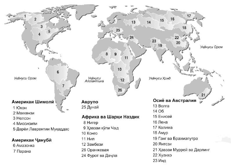 Рас. 3.3. Ҳавзаҳои дарёҳои калонтарини ҷаҳон (GRIDA-UNEP, 2002).