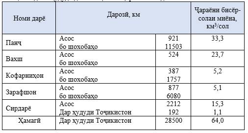 Ҷараёни солонаи умумии дарёҳо аз рўи солҳои гуногунобӣ аз 25 то 68 км3 тағир меёбад; аз ин ҳаҷм дар ҳудуди Тоҷикистон дар беҳтарин солҳо 52-53 км3-и он ташаккул меёбад (дар ҳавзаҳои Амударё – 50,5 км3, Сирдарё – 0,7 км3). Ва аз он ҳаҷми обгирӣ фақат 13 км3 –ро ташкил медиҳад, яъне танҳо чоряки ҷараёни дарёӣ барои сарфи оби миллӣ истифода мешавад, қисми боқимондаи он ба ҳудуди давлатҳои ҳамсоя ворид мегардад.