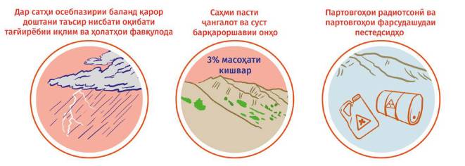 Зери таъсири партовҳои ҷаҳонии гулхонавӣ ва гармшавӣ майдони бо пиряхҳо пушидашудаи Тоҷикистон аз соли 1930 то ин ҷониб 25-30%– и он кам шудааст. Дар назар аст, ки то соли 2050 майдон ва ҳаҷми пиряхҳо боз 25-30 % кам гардад, ҳаҷми оби ҳавзаи дарёҳо аз ҳисоби обшавии босуръати пиряхҳо бошад аввал зиёд шуда, баъдан кам мегардад.