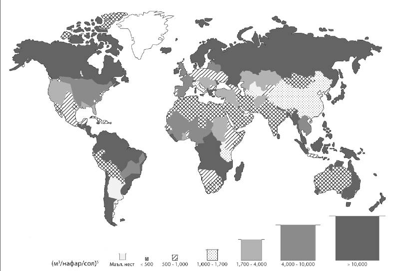 Расми 3.2. Тақсимоти глобалии (дастрас будан) об ба ҳар як сари аҳолӣ (Revenga, 2000).
