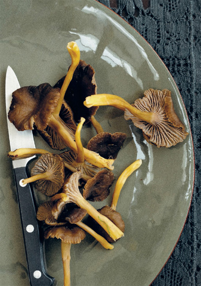 While the chicken is grilling, pan-fry the chanterelles in 1 tablespoon of olive oil for 3 minutes. Pour a mound of the mushrooms on a serving plate and lay the kebab sticks across them. You can make a separate dressing of olive oil and lemon juice if you want and pour that over thetop.