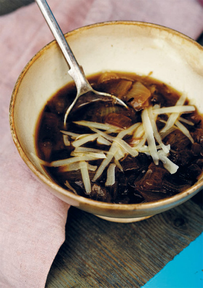 Purists will argue this is nothing like the real thing, which should be made with beef stock and have a great molten island of bread and cheese on top. I use vegetable stock and lose the bread—it’s not as heavy, yet still as decadent and comforting. The trick is slooooooooow cooking the onions, so they impart their rich caramelly flavour to the soup. A drizzle of good balsamic vinegar also gives it a rich enigmatic taste, perfect for a blowsy autumn day.