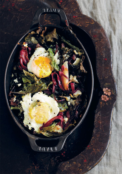 There is something redolent of the nursery tea about baked eggs. They are so easy and are a miniature cosy meal in themselves. Mix with Swiss chard—nutty, more-ish, and oh so good for you.