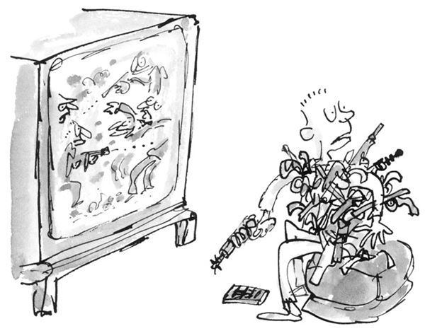 Девятилетний обладатель золотого билета сидел перед огромным телевизором и, ни на минуту не отрываясь от экрана, смотрел фильм, в котором одна шайка гангстеров расстреливала из пулеметов другую шайку гангстеров. Сам Майк Тиви был обвешан не менее чем восемнадцатью пистолетами разного калибра. Время от времени он вскакивал со стула и стрелял.