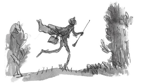 – Я стоял за нашей кибиткой, – сказал папа, – и была ясная лунная ночь, и я посмотрел вверх и вдруг увидел, как с вершины холма сбегает кто-то невероятно высокий. Он бежал вприпрыжку, гигантскими шагами, а за ним развевался чёрный плащ, как будто птичьи крылья. В одной руке у него был чемодан, а в другой – труба, и когда он добежал до высоченной живой изгороди на краю поля, то попросту через неё перешагнул.