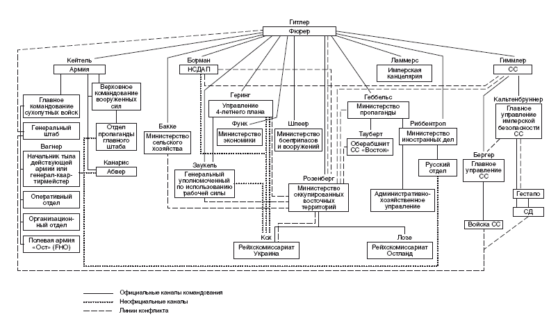 Эта «большая восьмерка» и большая часть подконтрольных им ведомств зачастую конфликтовали друг с другом. Эти конфликты можно классифицировать по четырем категориям: личностные конфликты на почве личной неприязни (например, между Розенбергом и Риббентропом); борьба за власть и авторитет между отдельными участниками (например, Гиммлером, Геббельсом и Борманом) и между ведомствами (например, партией, государством, СС и армией); конфликты на почве юрисдикции (например, соперничество за право контроля над средствами связи на оккупированном Востоке); политические споры о тактике или принципах в отношении настоящего и будущего Востока (например, борьба за судьбу колхозов).