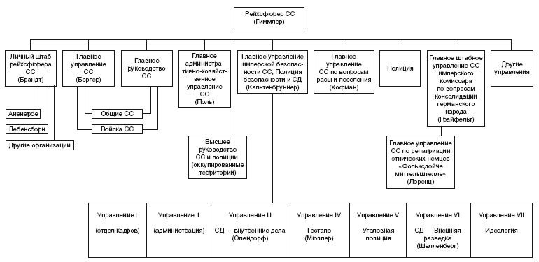 «СС» был общим термином для обозначения империи Генриха Гиммлера. По-разному организованные и реорганизованные, на самом деле они включали в себя, помимо изначальных отрядов охраны, полицию, гестапо и элитные боевые подразделения ваффен СС. РСХА (Reichssicherheitshauptamt, Главное управление имперской безопасности), которое также находилось под командованием Гиммлера, и его филиалы охватили широкий спектр разнообразных видов деятельности. Это была «империя внутри империи», и Гиммлер как рейхсфюрер СС был ее бесспорным вождем. Он обладал настоящей властью, более автономной, чем у его соперников, властью, которую боялись все, кому довелось с ней столкнуться, и те, кто соперничал с ним за почетное место в нацистской Валгалле.