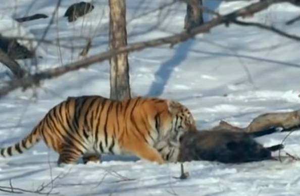 Произошло это примерно чуть более суток назад. Тигр выследил небольшое стадо кабанов, скрал его и залег на предполагаемом пути движения. Атаковал из засады – кабаны, двигавшиеся цепочкой, «чухнули», по выражению Николая, веером в рассыпную. Но тигр, видимо успел схватить зазевавшегося молодого кабанчика.