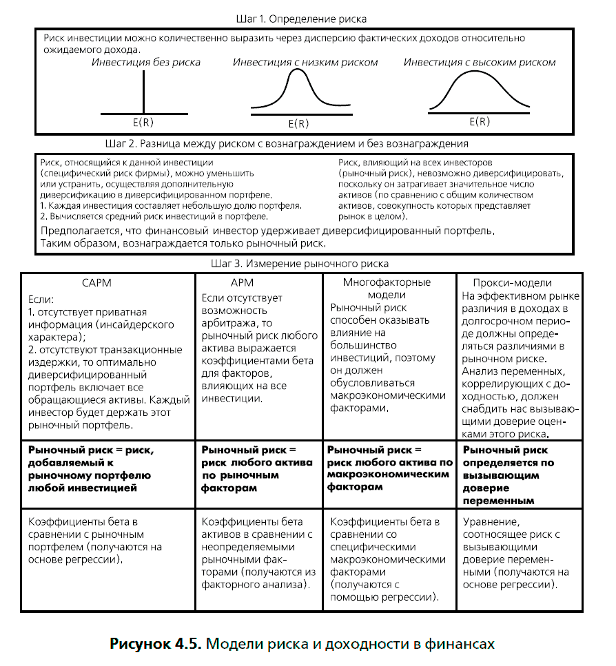 На рисунке 4.5 отображены все модели риска и доходности, применяемые в финансах. На первых двух шагах указаны их общие характеристики, а также различия в способе определения рыночного риска.