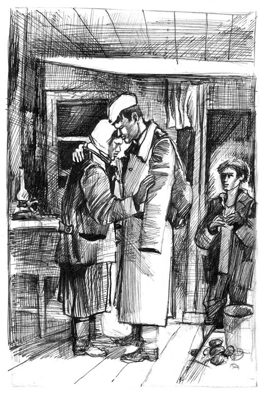 …И мать осталась стоять на холодном тёмном крыльце под звёздами, а мы по песчаному, затвердевшему от утренника пригорку тихо спустились к озеру.