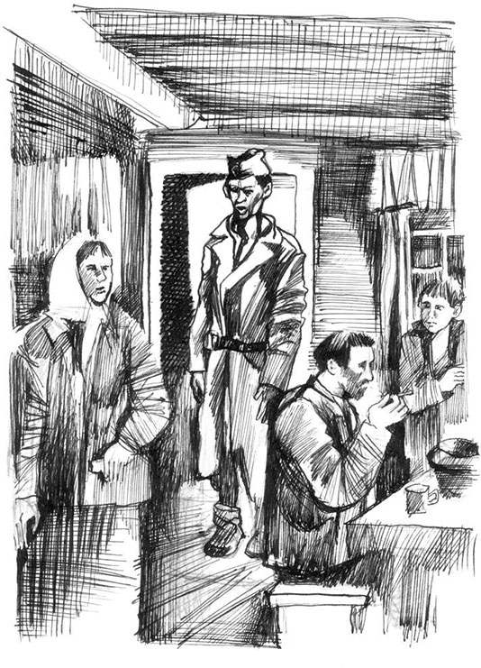 В длинной солдатской шинели, с мешком на плече и с лёгким пустым рукавом. Он вошёл вечером, на закате, когда мы с матерью молча чистили возле пыльного солнечного окна перемёрзлую картошку. Небритый, худой, отец неловко, одной рукой обнял сунувшуюся навстречу мать, улыбнулся, а мешок медленно пополз с плеча, и вот скользнул по рукаву, качнулся на согнутом локте – и улыбка отца погасла… Но всё равно теперь мы были самыми счастливыми людьми в деревне. Ещё бы. – Жив!