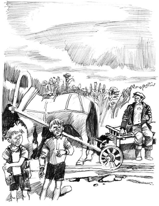 Мы с Сашком бредём домой. На пути нам попадается телега с задранной коровой. Брюхо у неё пропорото от паха, торчат сломанные рёбра.