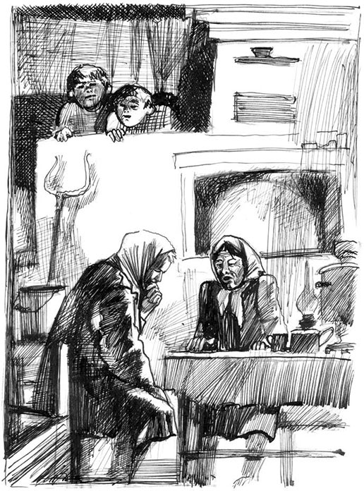 Раздвигаю занавески: за столом сидит бабушка с какой-то женщиной, что-то вроде нищенки или погорелой, в потёртом чёрном пиджаке, как у дяденьки-возницы, в чёрном платке. Бабушка подливает ей в глиняную миску похлебки, женщина аппетитно ест и рассказывает: