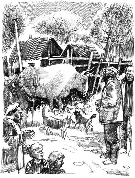 Нас с Сашком словно ветром выносит из-за стола. Прибегаем на ферму. Толпа народу: мужики, бабы, дети. В калде, у огромного лопуха, стоит огромный белый бык, с железным кольцом в ноздрях. Глаза кровавые, страшные, он ревёт, высуня язык, кося глазом и пуская пену. Копает под собой землю, поводит рогами. Две собаки крутятся перед его мордой. Пастухи подзадоривают их. Мужики ругаются, другие спорят, бабы охают и ахают, дети визжат от восторга. Кто-то кричит: «Едет!» Обернувшись, вижу подъезжающую двуколку, а в ней председателя в пиджаке, фуражке и сапогах. Подъехав, он лихо соскакивает на землю, выхватывает из пролётки ружьё и, нагнувшись, между жердей залезает в калду. Подходит близко к быку, который сразу затаился и притих, взводит курки и почти в упор выстреливает быку прямо в лоб.
