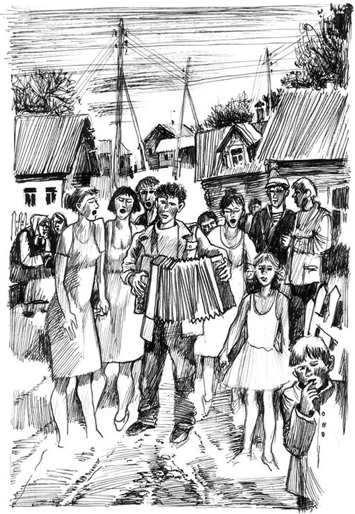 Мы с Сашком сидим на крылечке Светланкиного дома. Светланка в чистом платьице и всё поглядывает на меня. Весёлая процессия входит в деревню. Девки идут, взявшись под руки, во всю ширину. В середине высокая, чернобровая, черноволосая, не знаю, как её звать, и назову хоть Шурочкой. Голос её сочный, густой. Парни точно так же, только не под руки, идут следом. Гармонист между рядов. По ту и другую стороны, кто на завалинках, кто на лавках или как мы на крыльце, сидят старики и старухи. Точнее, почти одни старухи-вдовухи, потому что стариков в деревне всего пять.